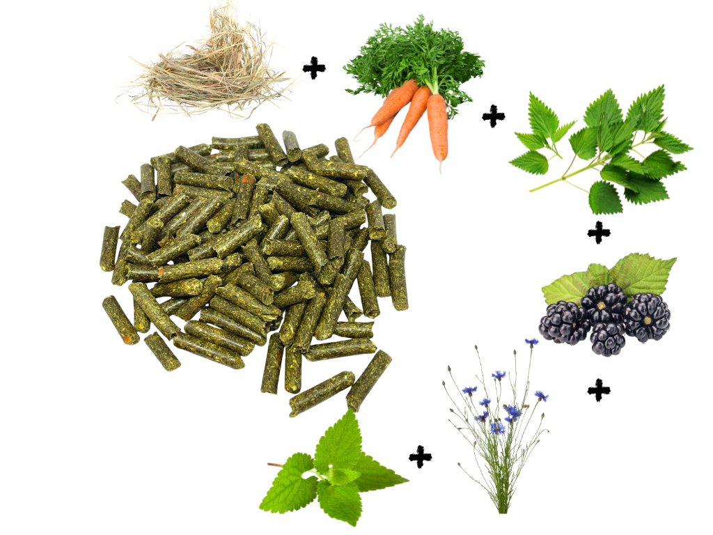 🌱 Vysoký podíl sena (80 %) – přirozený zdroj vlákniny pro zdravé trávení a obrušování zubů.